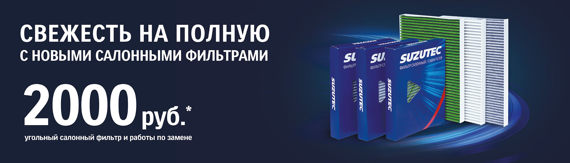 - 2 500 руб.* - стоимость работ и запчастей при замене на антибактериальный салонный фильтр SUZUTEC.